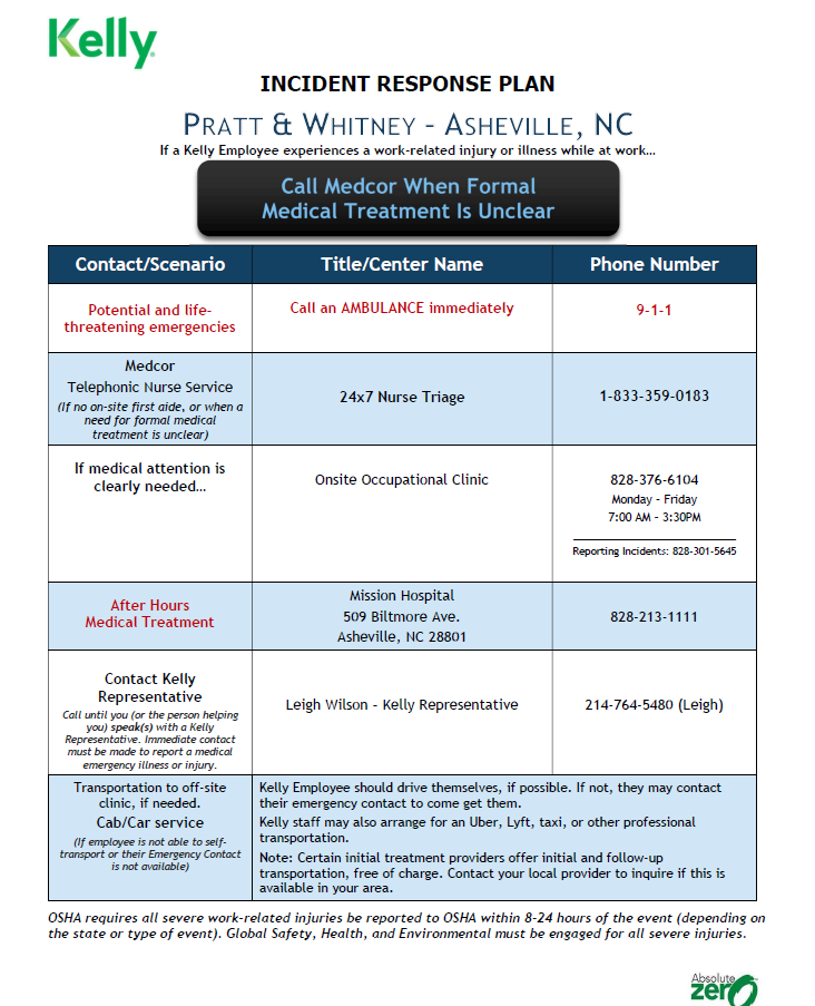 We want only the best success for you! Your safety is very important to us. All employees are required to report any work-related illness or injury to a Kelly Services Representative, immediately upon experiencing symptoms.